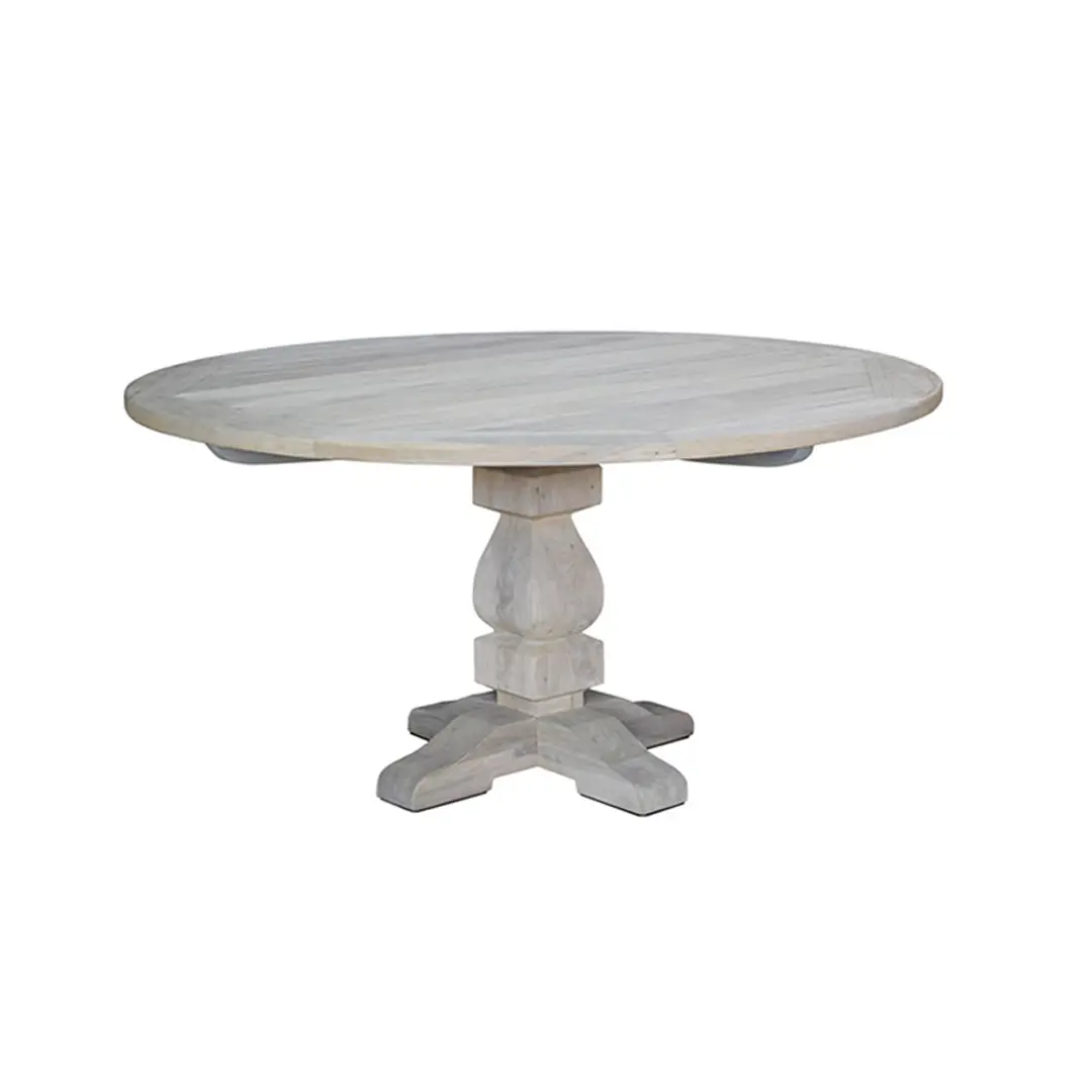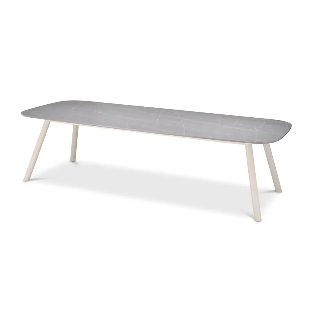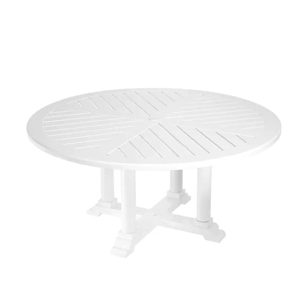 White outdoor dining table with chairs and glassware