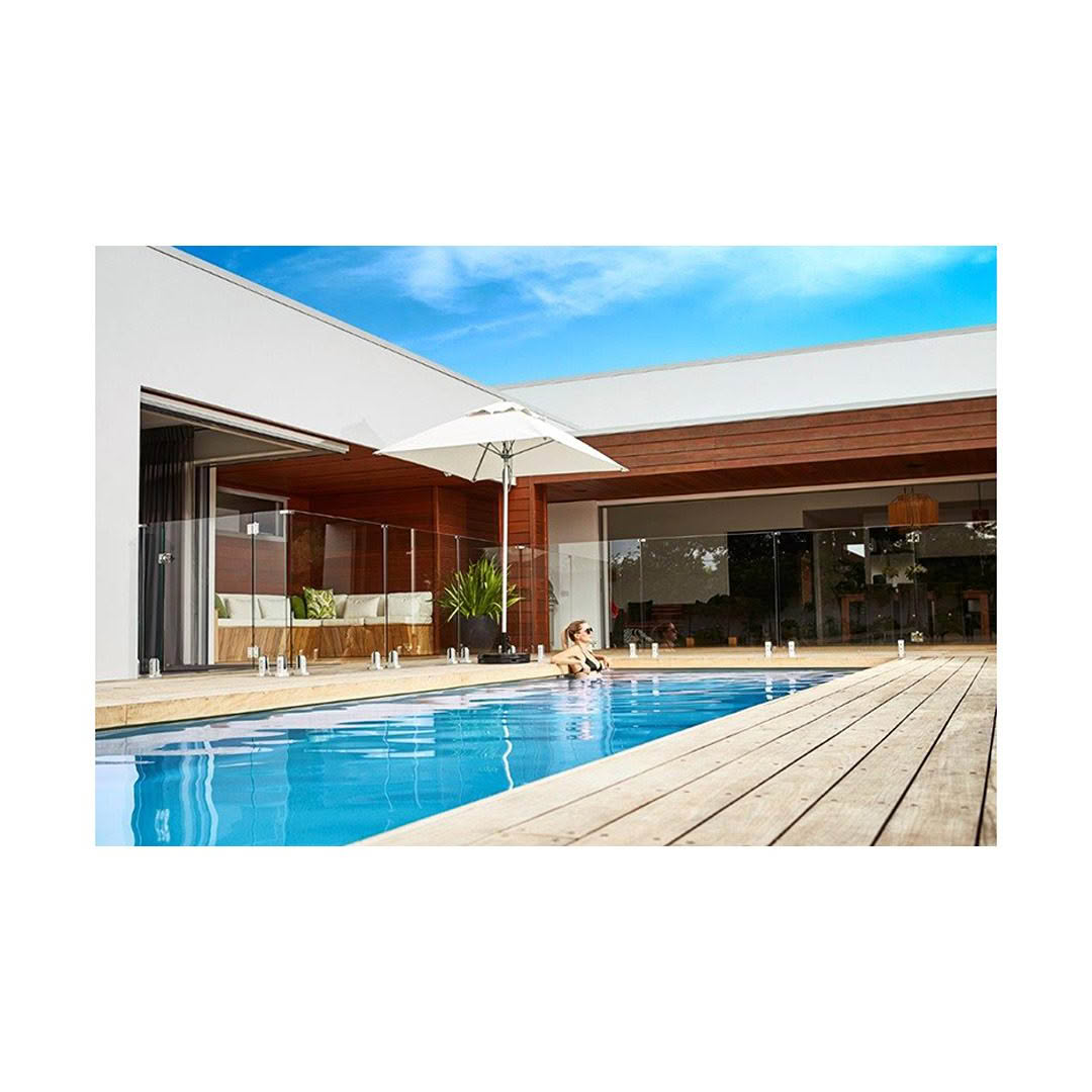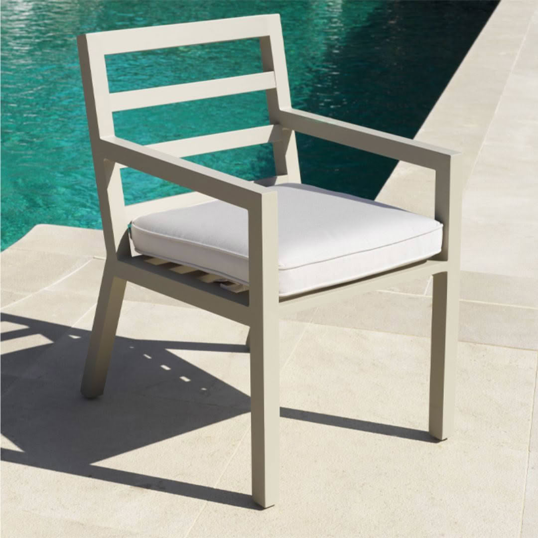 Modern wooden armchair with white cushionsWooden chairs by poolside patio doors