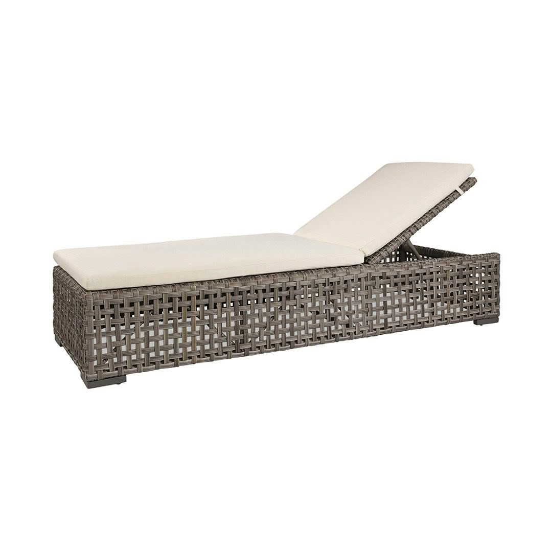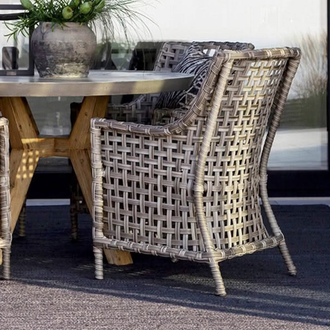Gray wicker outdoor sofa with white cushionsElegant outdoor patio with wicker furniture and greenery