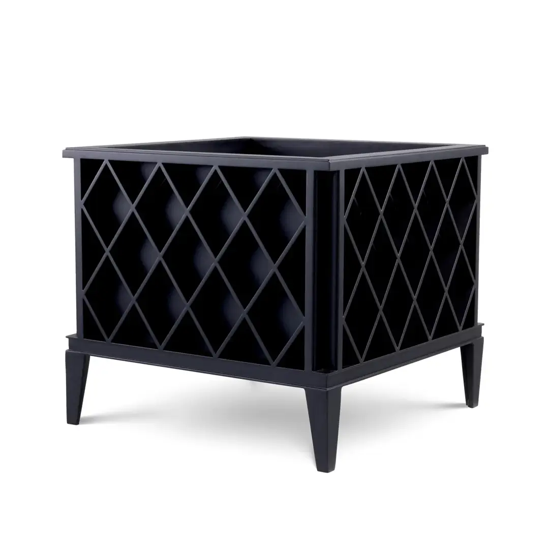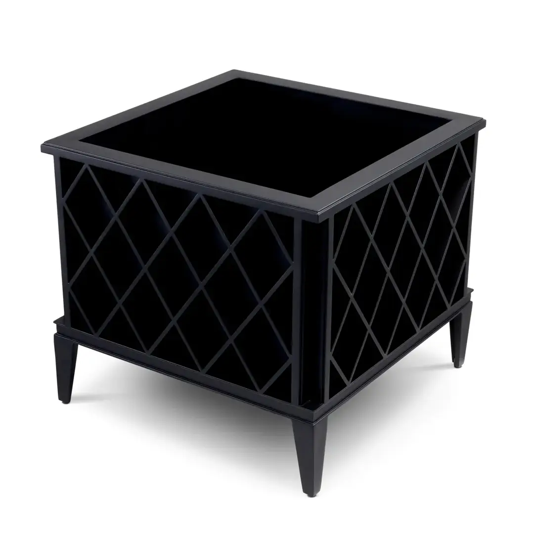 Modern black square coffee table with lower shelfElegant patio with furniture and Mediterranean architecture