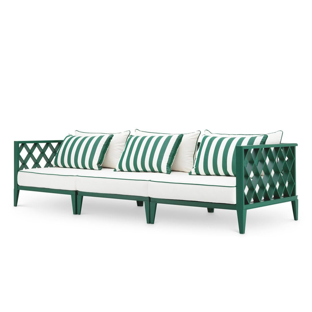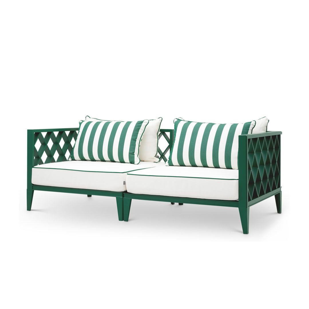 Outdoor wicker sofa with white cushions and lantern