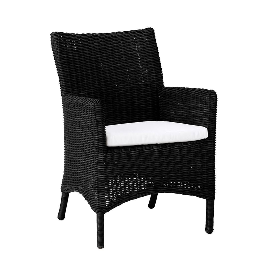 Wicker armchair with white cushions isolated on whiteCozy wicker chair with cushions and throw blanket