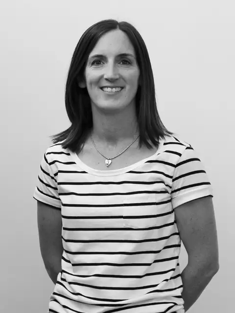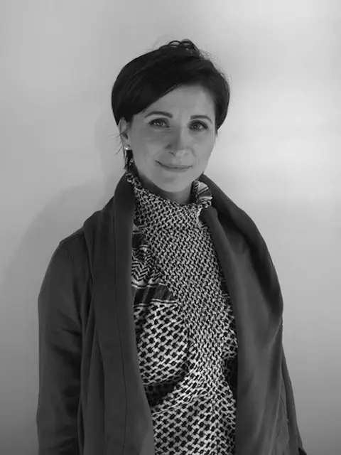 Woman in floral shirt smiling slightly, black and white photo