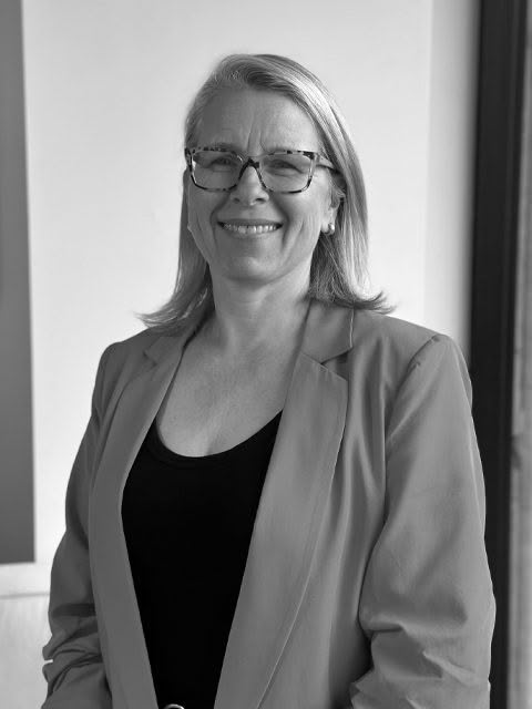 Smiling woman in brown blazer seated in office chair
