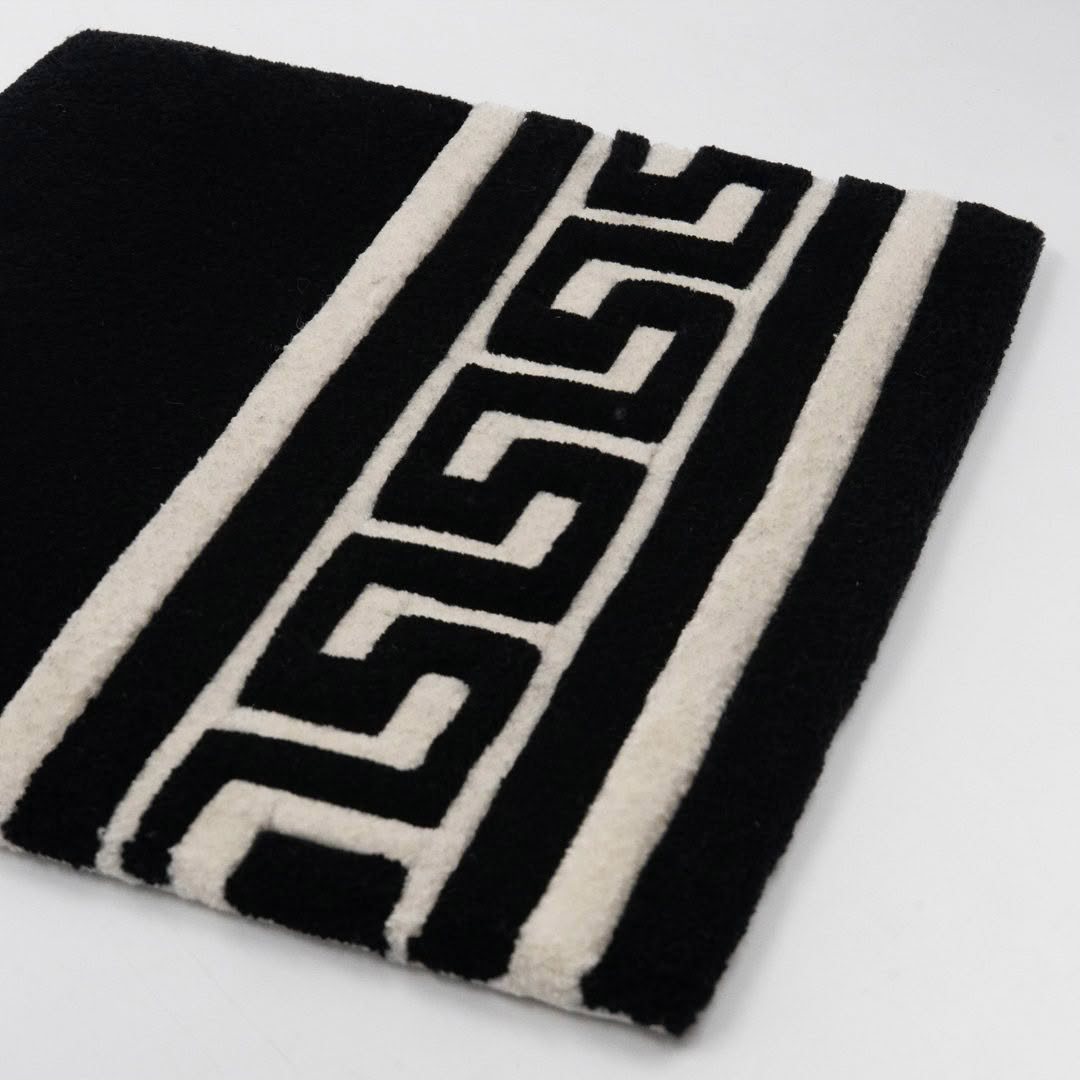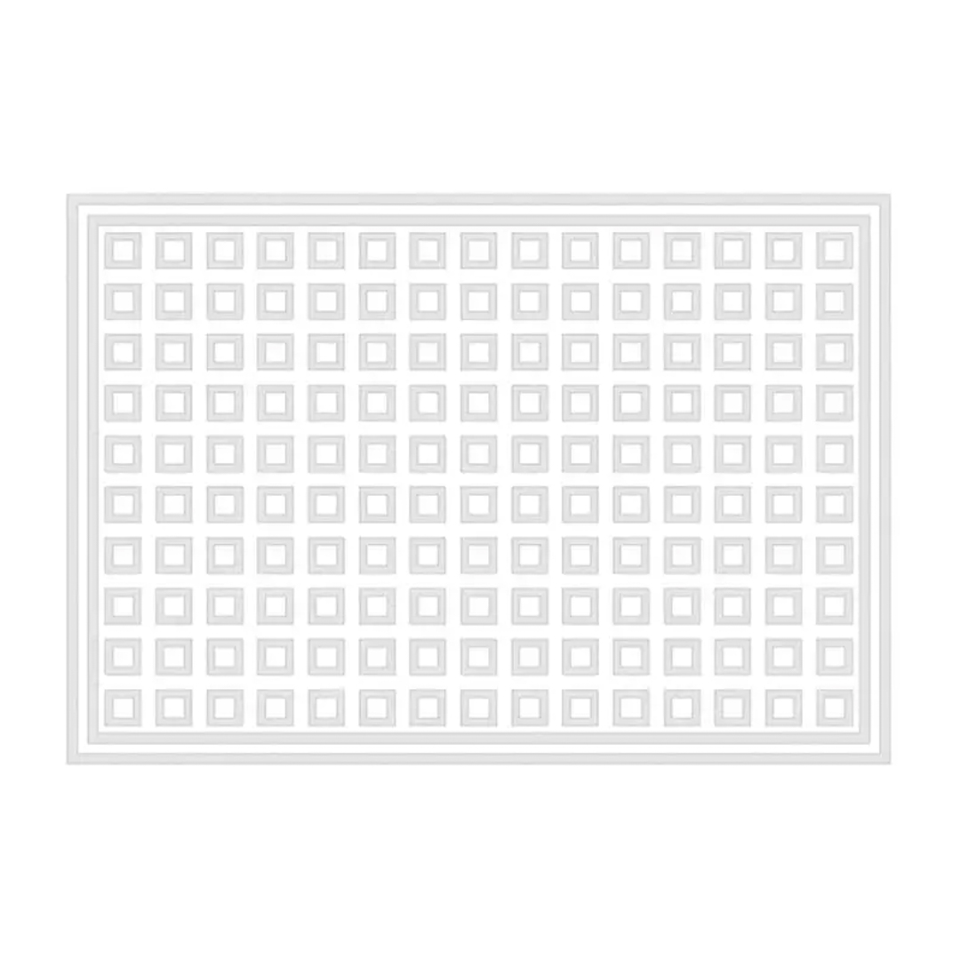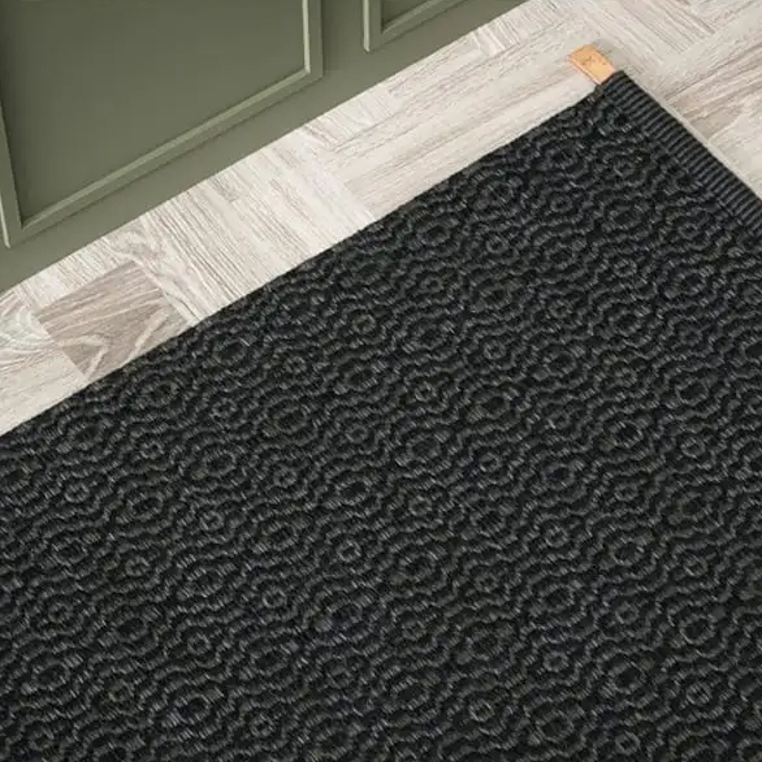 Close-up of patterned dark gray carpetBlack rectangular rug with white grid pattern