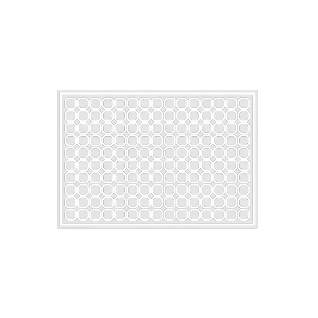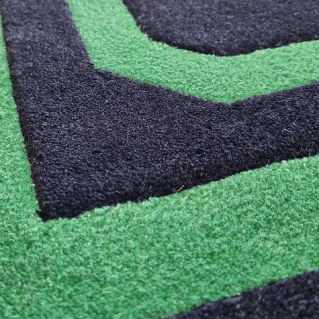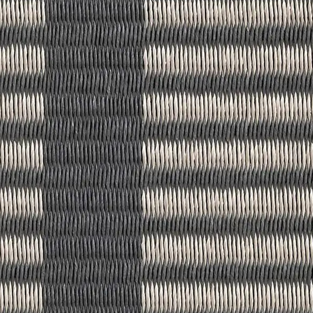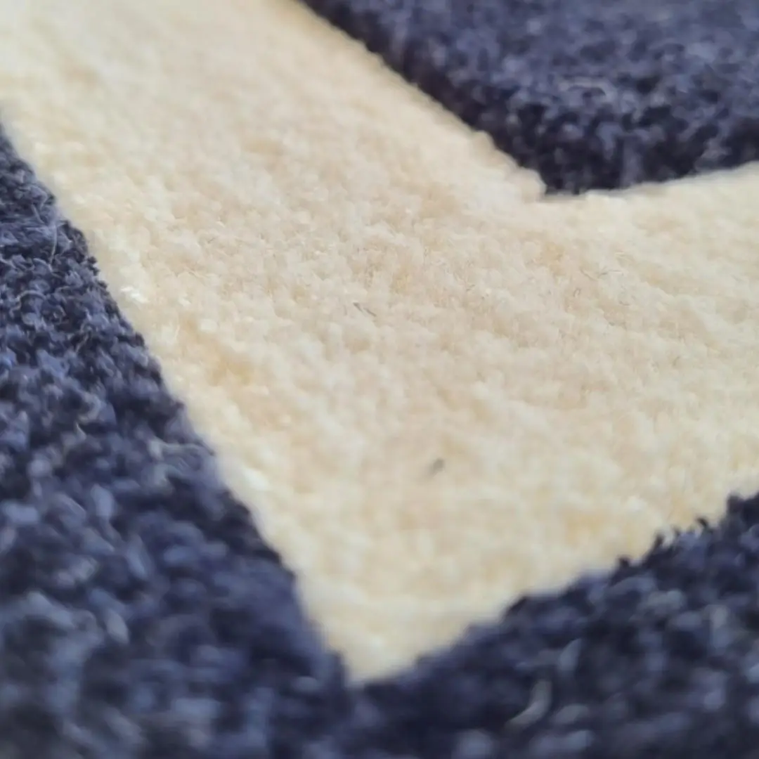 Close-up of patterned dark gray carpetBlack rectangular rug with white grid pattern
