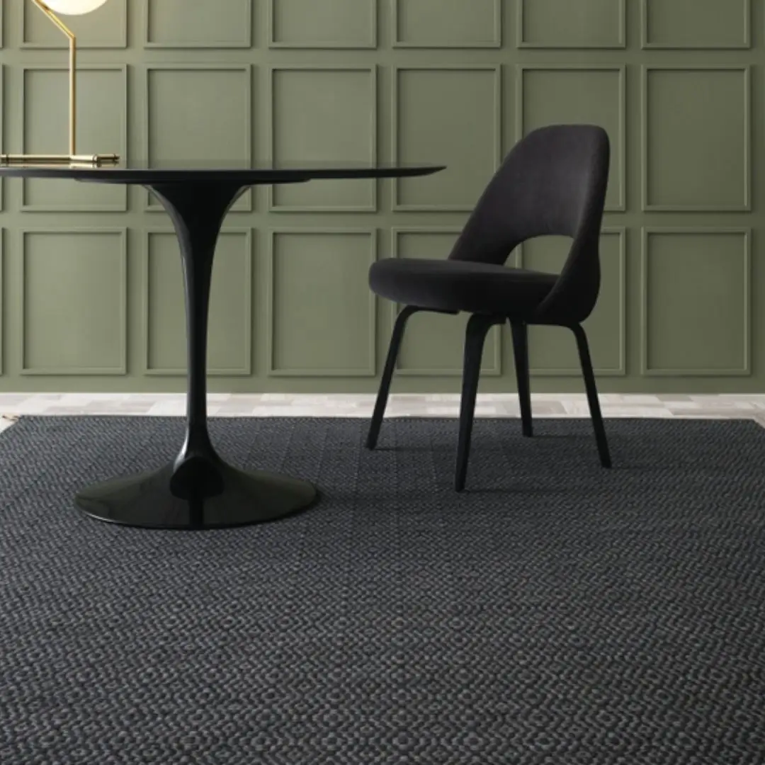 Wooden chair on textured rug against black wallModern room with textured rug and stylish furniture