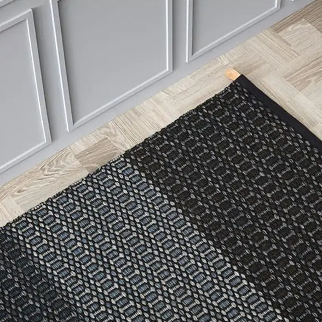 Gray and black patterned rug with blue accent