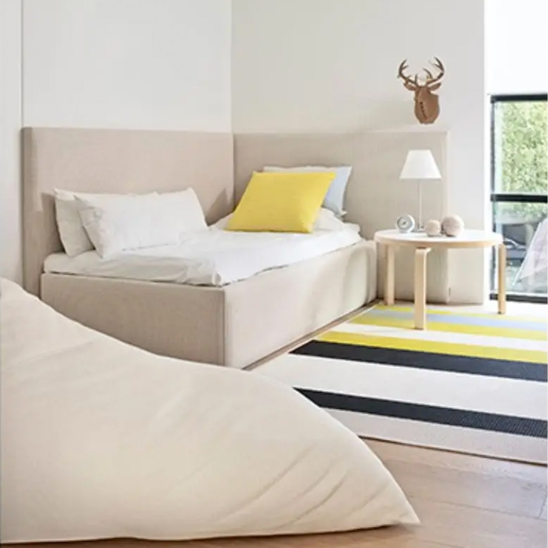 Yellow velvet sofa on geometric patterned gray rugModern bedroom with elegant pink and gold rug