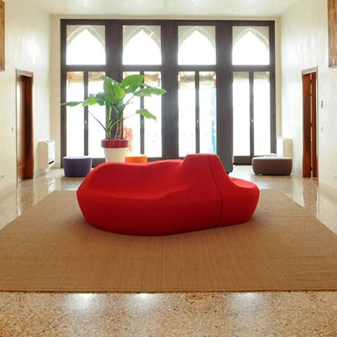Modern living room with large windows and unique rugColorful abstract wavy carpet design