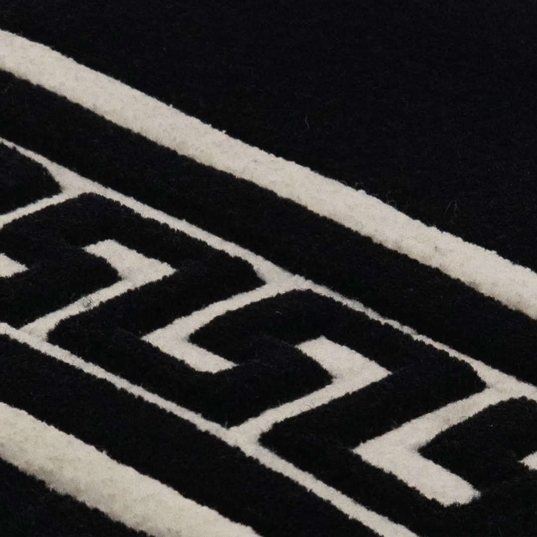 Modern curved sofa in a minimalist living roomClose-up of patterned black and white rug