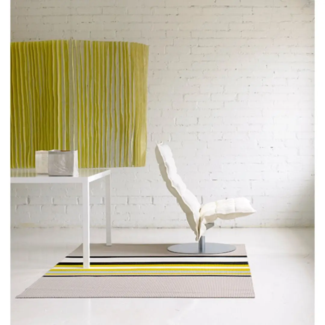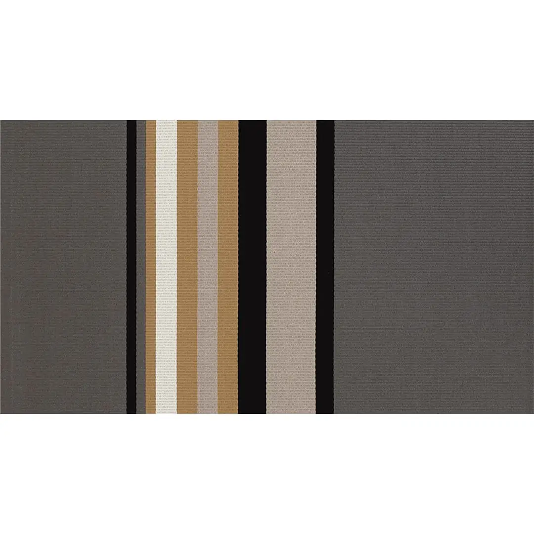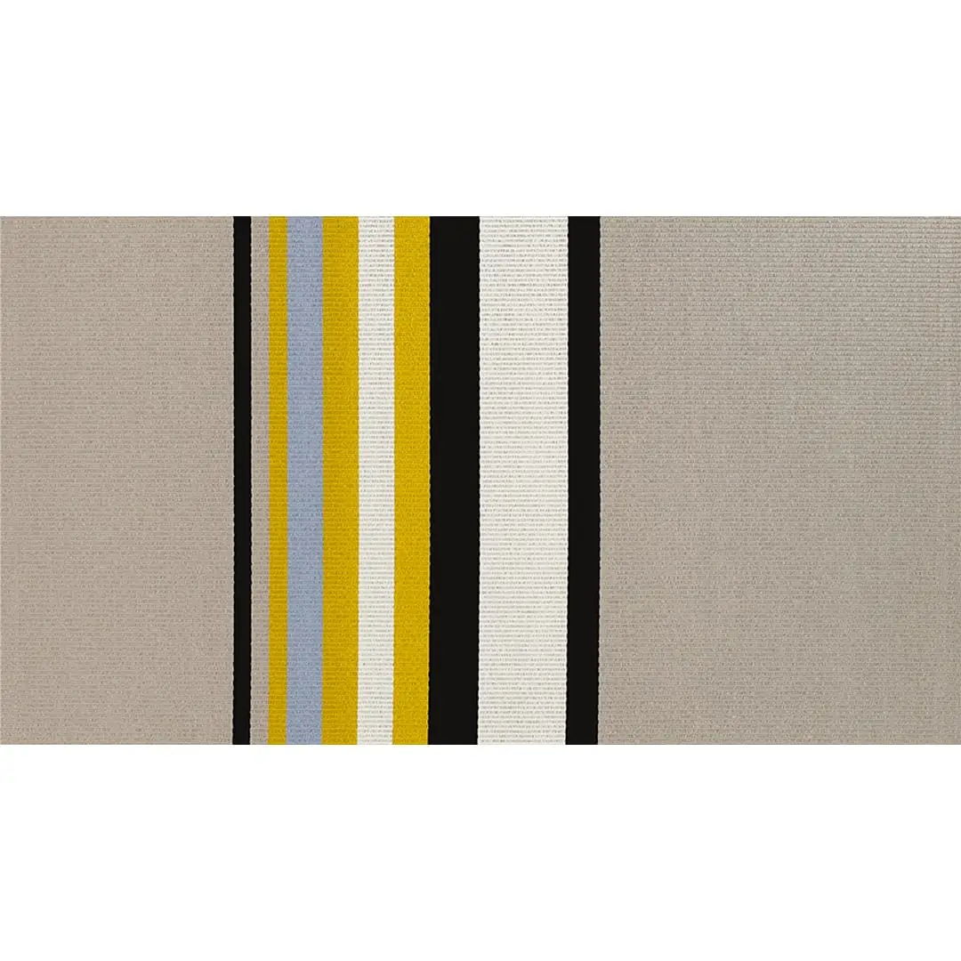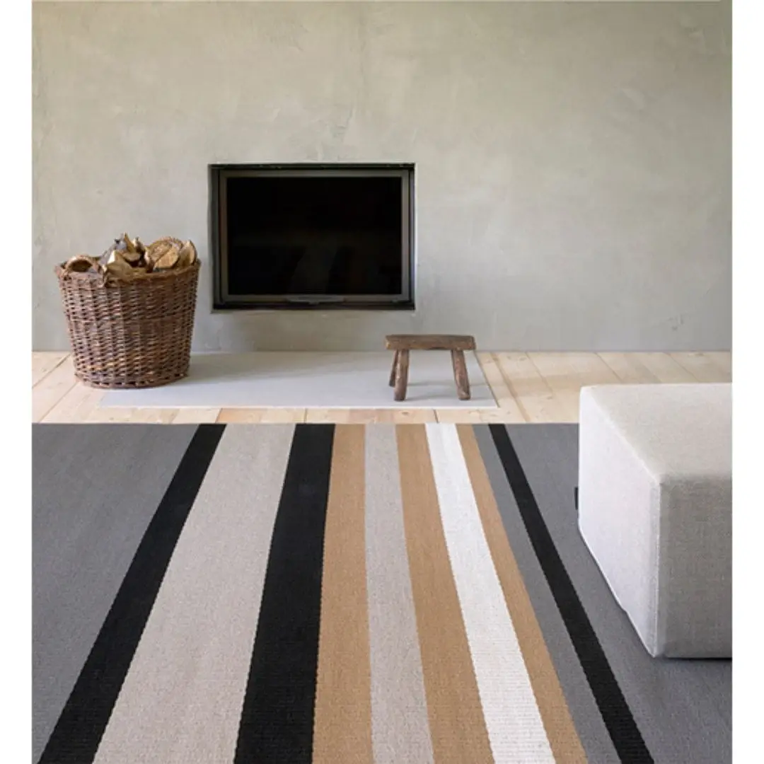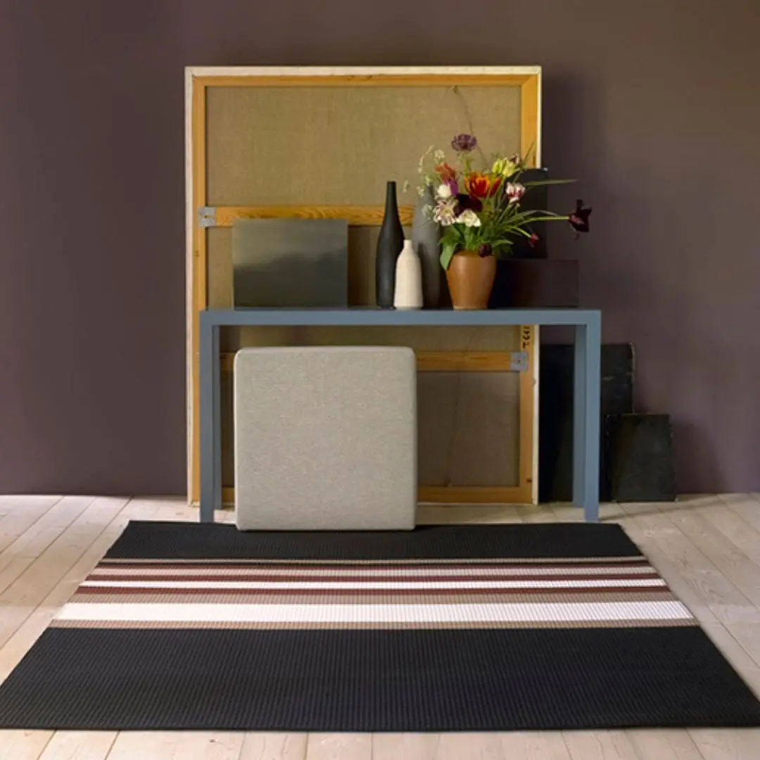 The multi-colored stripes of the Horizon carpet are placed on the unicolored base asymmetrically in respect to the length of the carpet. The width of the stripy area is determined by the length of the carpet, but is always at least 90 cm.