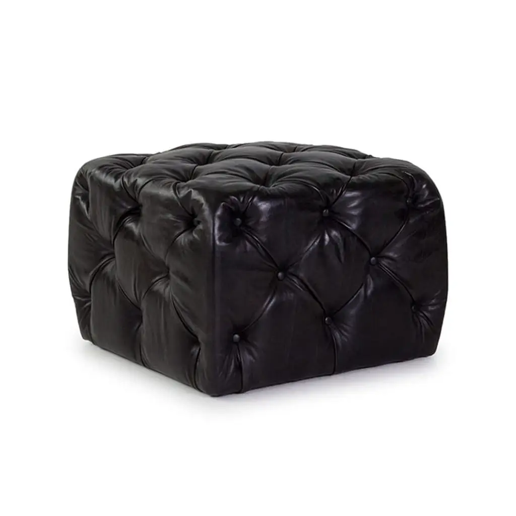 Brown leather tufted ottoman with wooden legsBrown leather tufted ottoman with nailhead trim