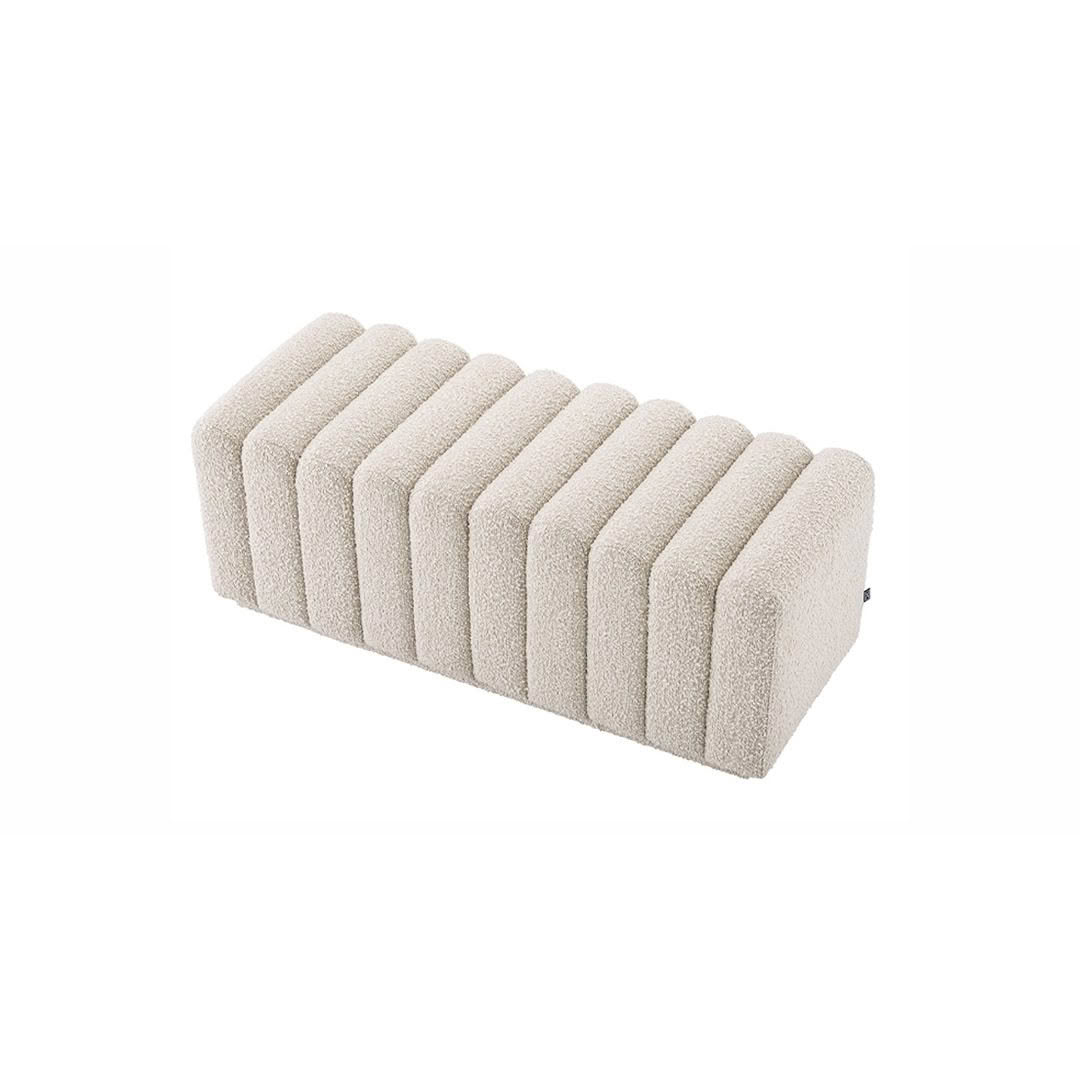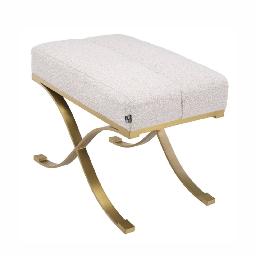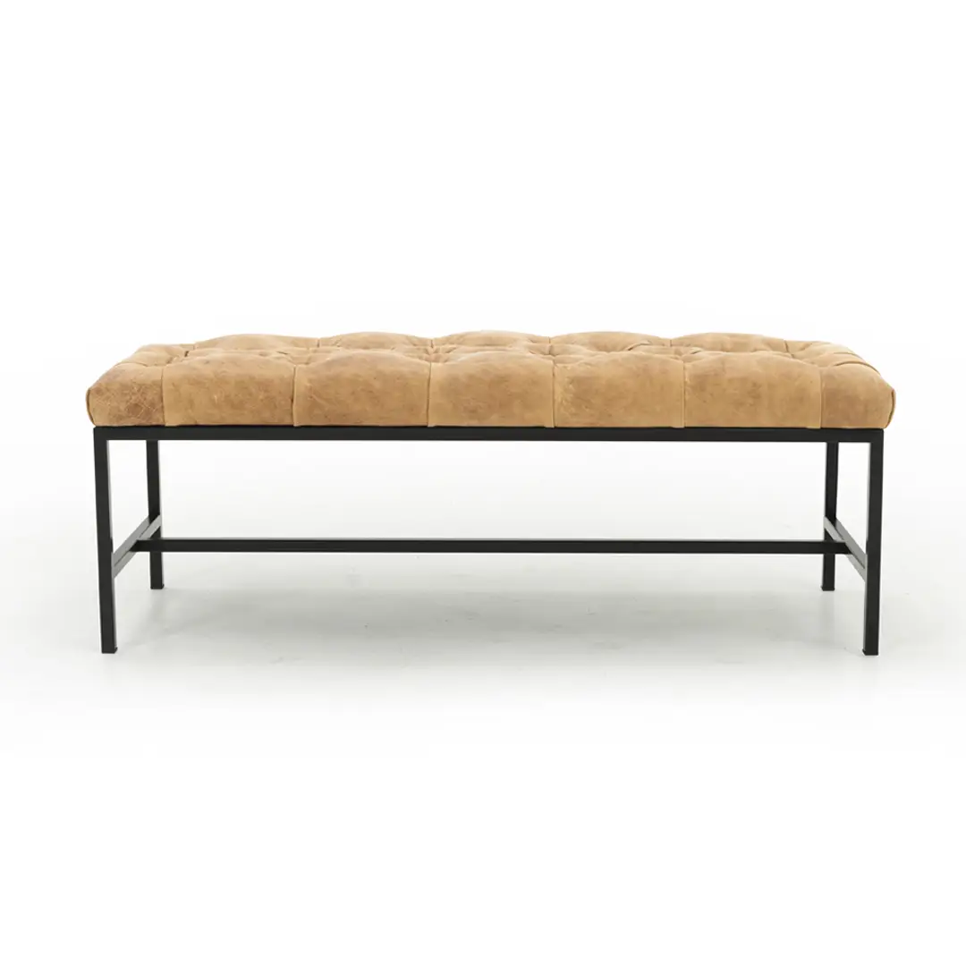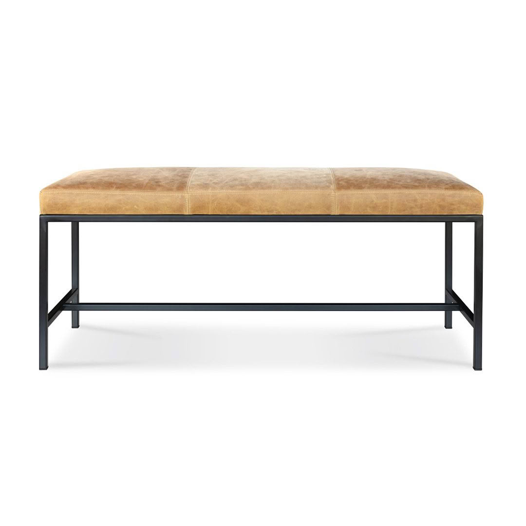 Elegant modern bench with golden legs and beige cushionModern living room with sofa and scenic window view