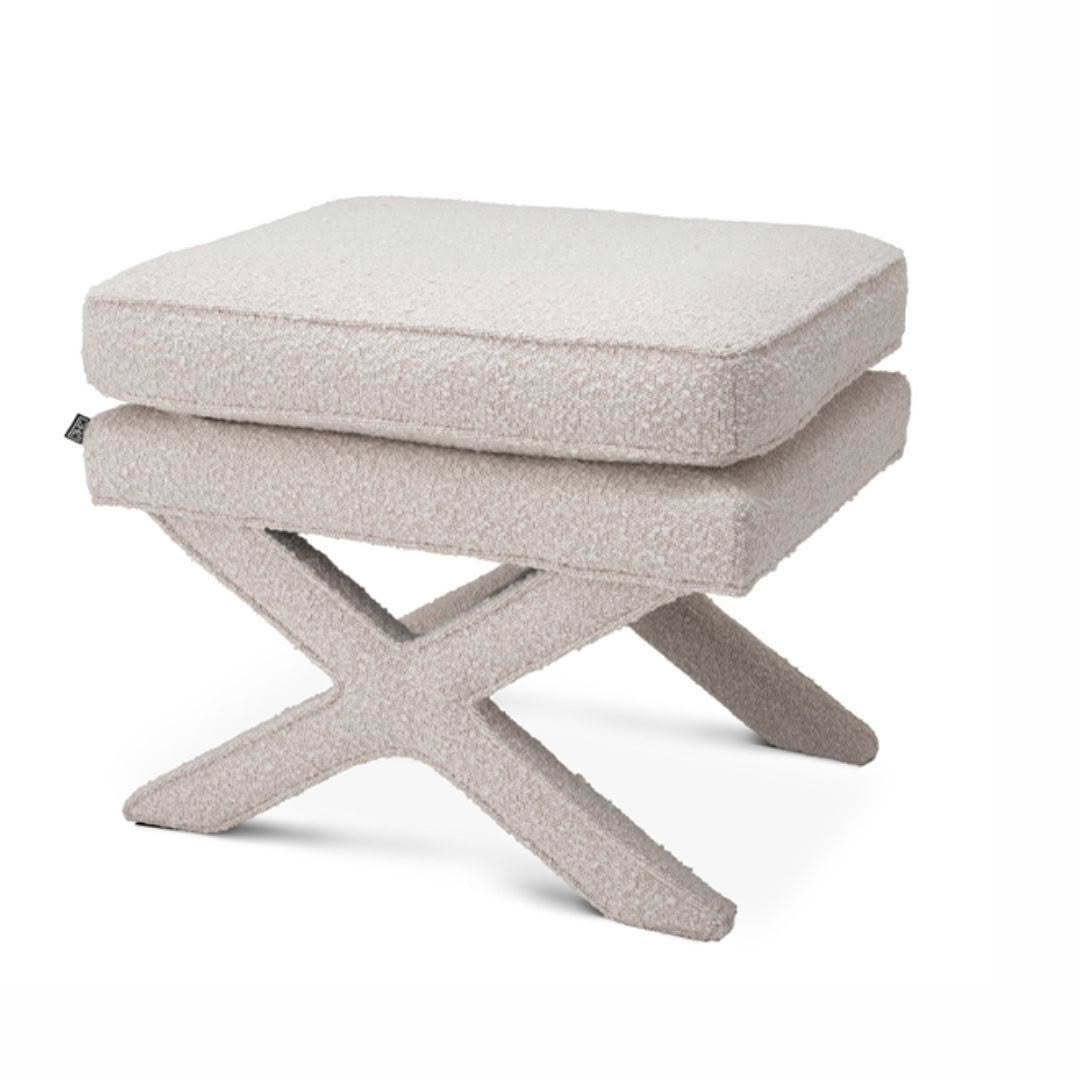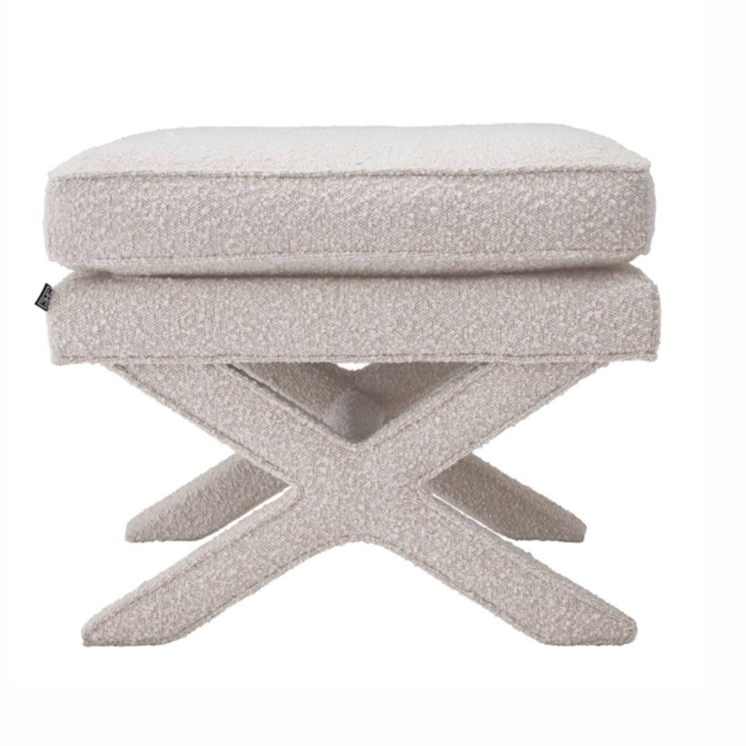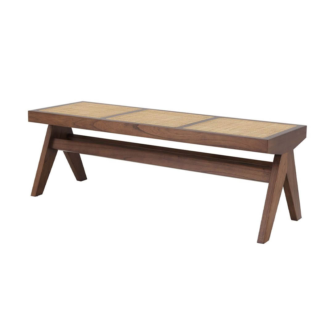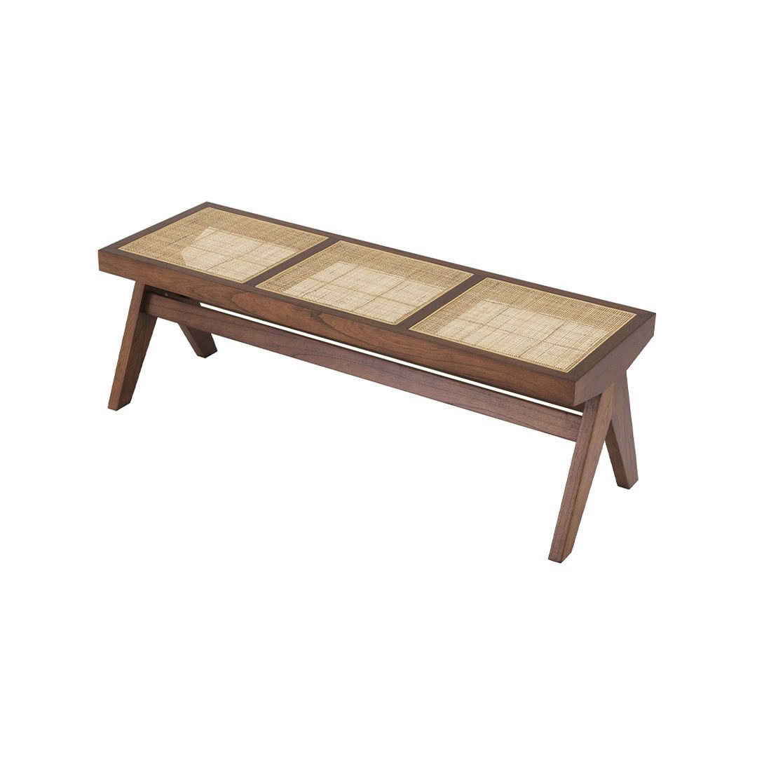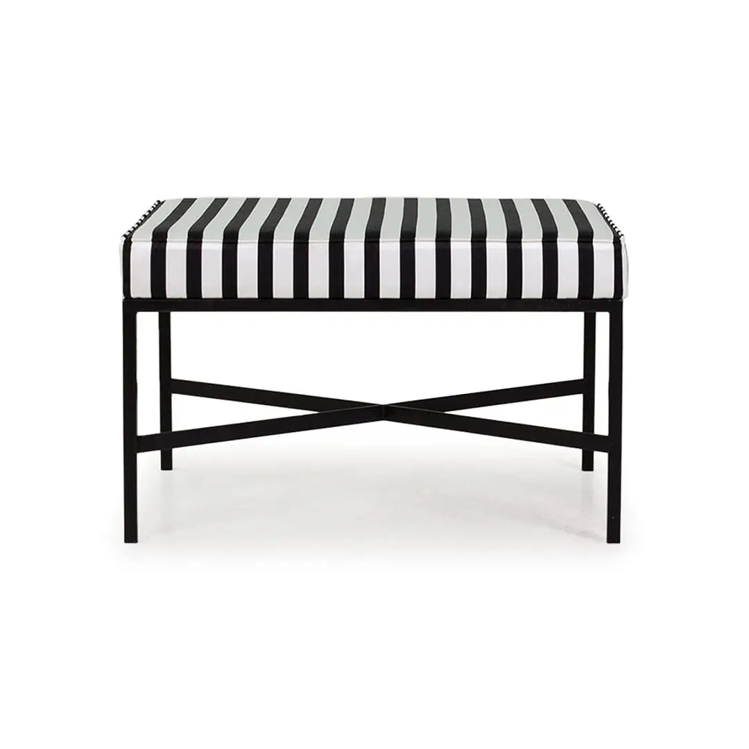Elegant modern bench with golden legs and beige cushionModern living room with sofa and scenic window view