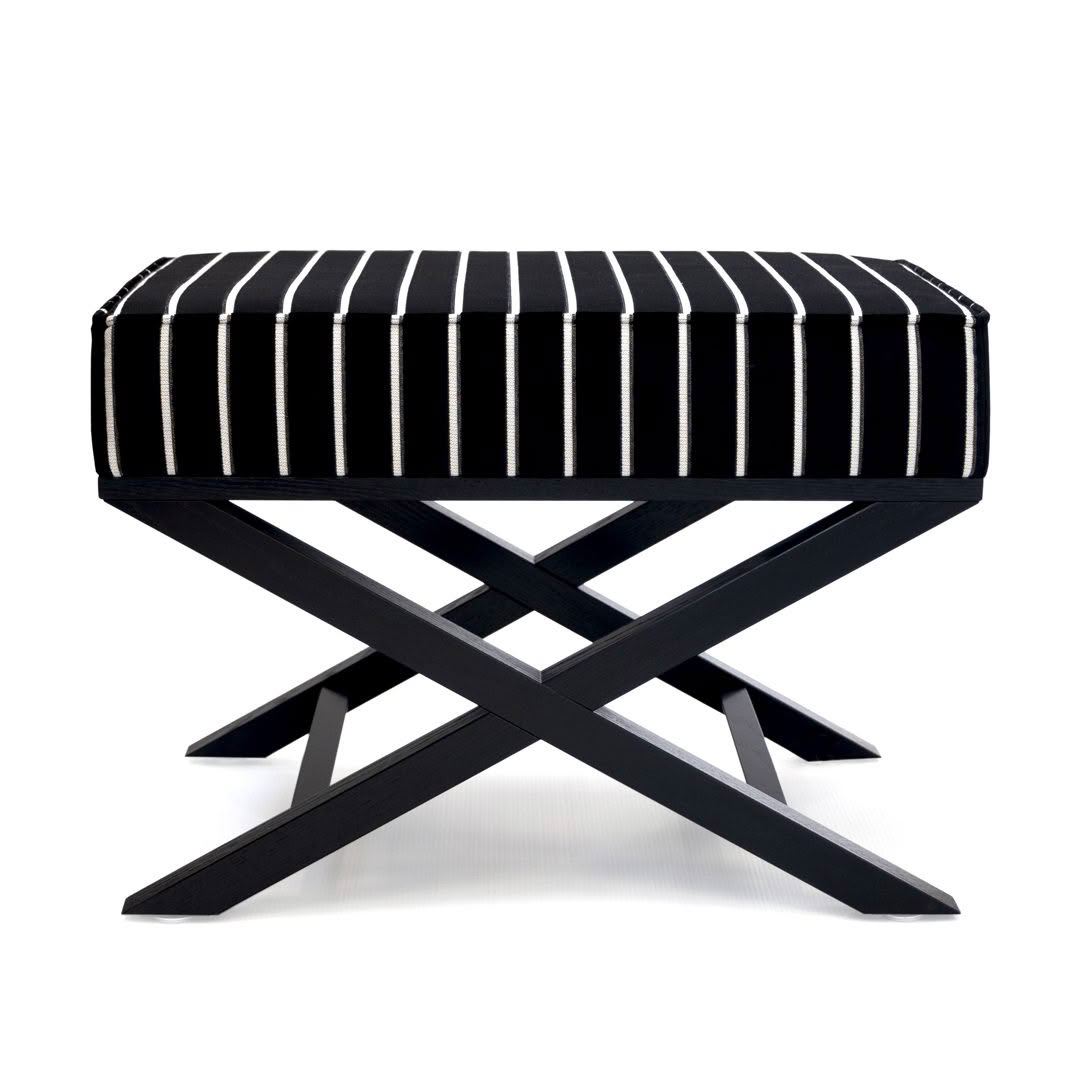 Black tufted leather bench on carved wooden legsElegant black tufted ottoman with wooden legs
