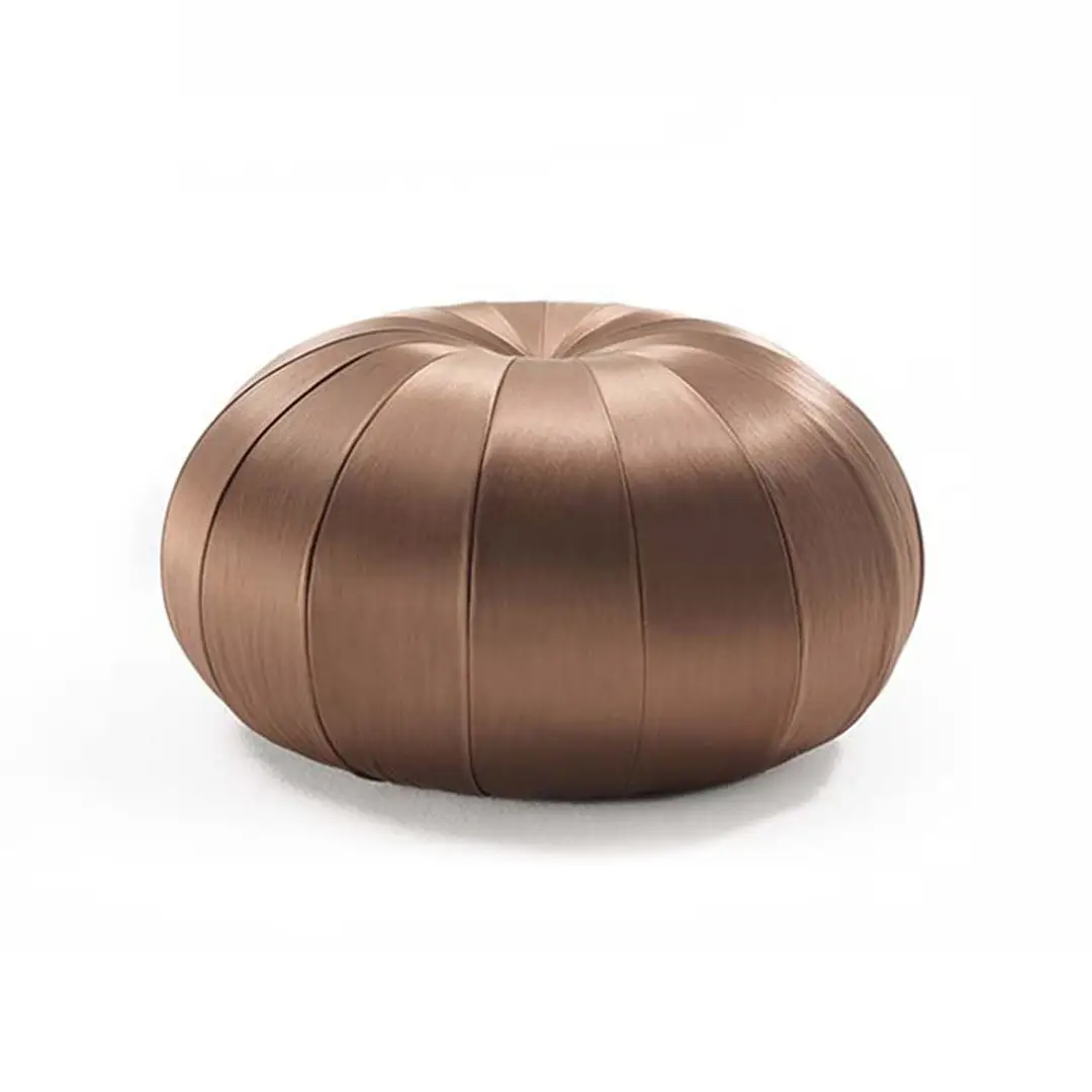 Round beige ottoman with black metal baseTan leather round stool with black metal frame